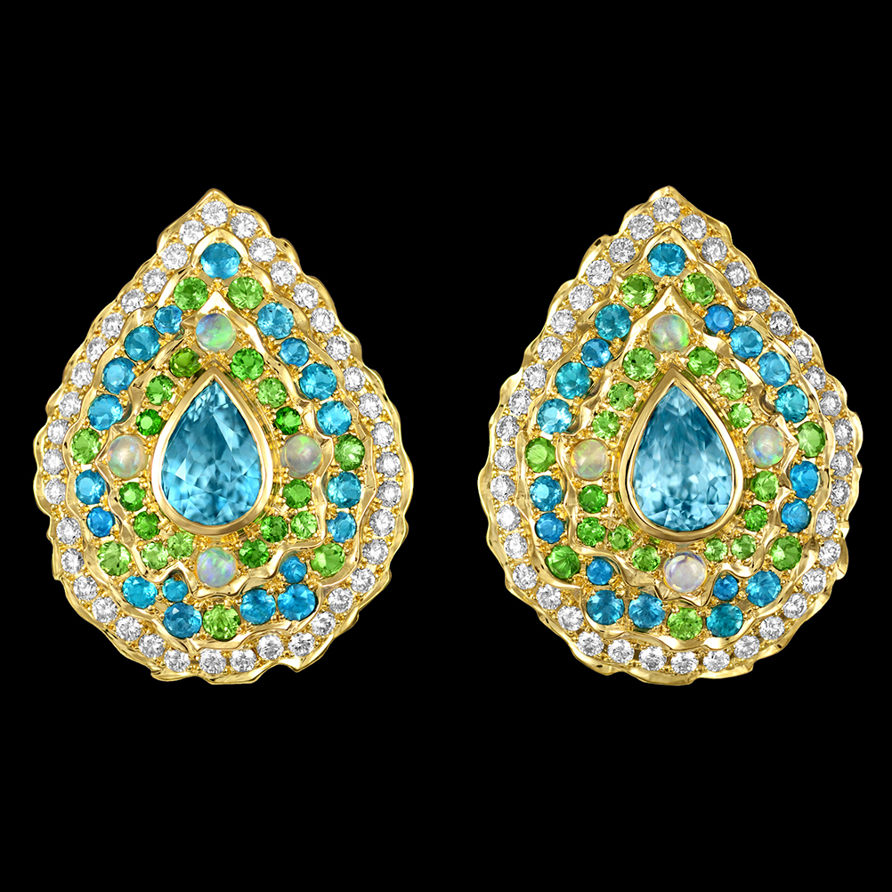 18K yellow gold earrings with Zircon, Opal, Diamond , Apatite and Tsavorite. This jewel was part of the exhibition titled “The Shape of Matter n Through an Artist’s Eye” at the Perot Museum of Nature and Science from October 21st, 2021 through April 20th, 2022.