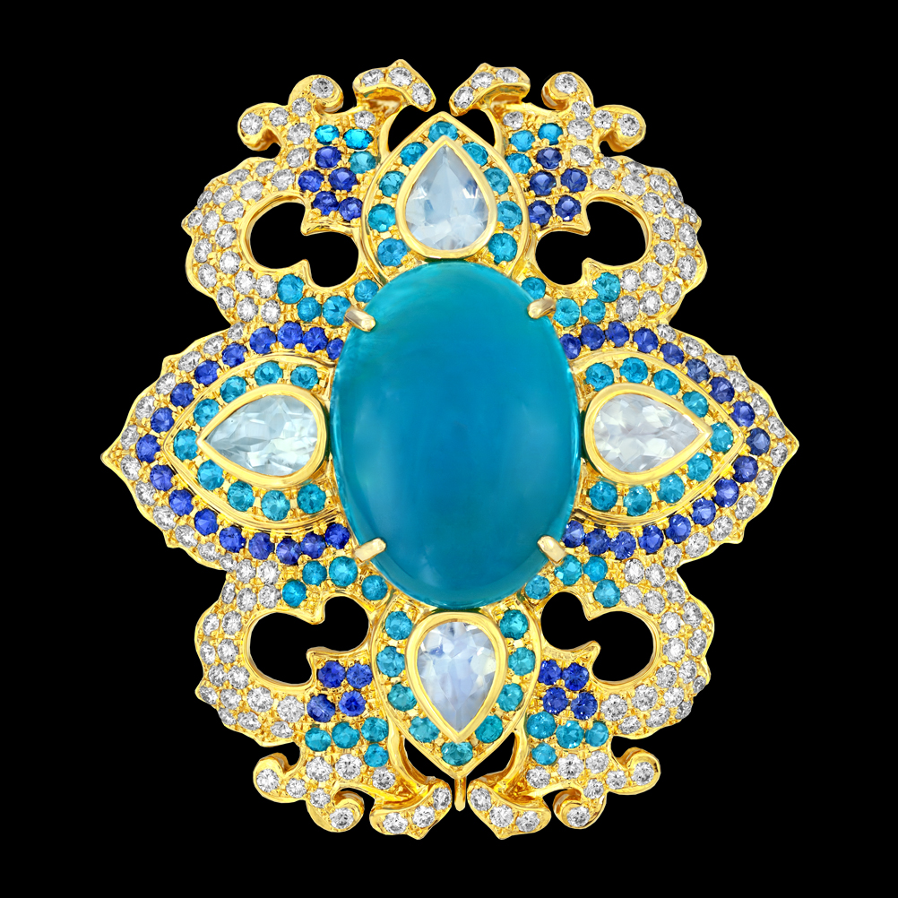 18k yellow gold with Arizona Chrysocolla, Diamond, Moonstone, Sapphire and Apatite.