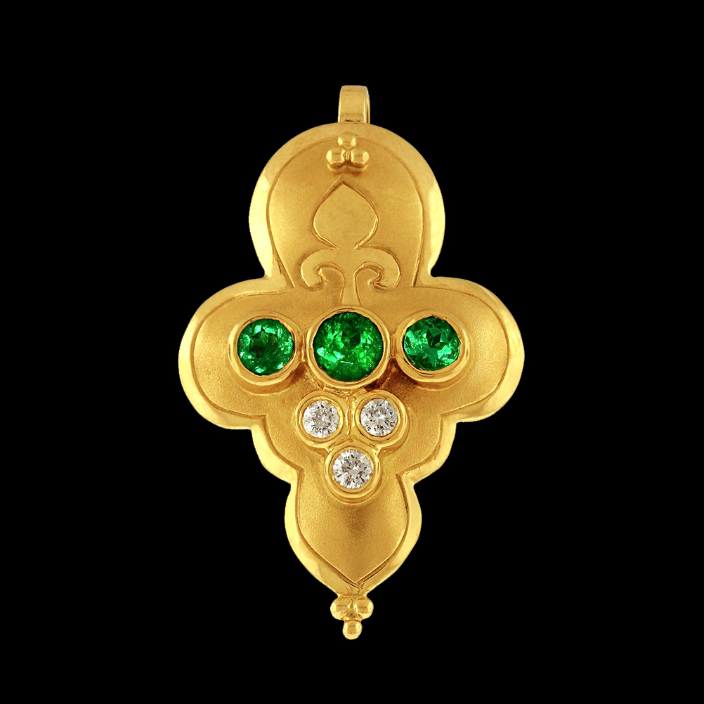 A versatile series pendant that can easily transform into a bracelet, necklace, or a brooch is set with Muzo emeralds and crisp white diamond melee. The fleur-de-lis and satin finish add another dimension to this very beautiful Crevoshay. 18K yellow gold with Emerald and Diamond. Gallery Collection.