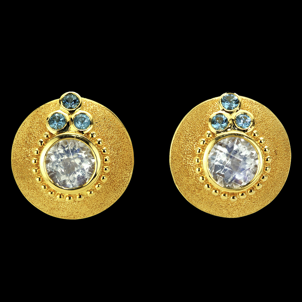 These beautiful button earrings contain all the wonderful elements Crevoshay is known for; the unusual faceted blue flash Moonstones are perfectly complimented by the Zircons, the stones are enhanced by the bright finish of the bezels which is set off by the granulation. They are all at home in the lush field of the stipple finish which in turn is bounded by bright edging. All in all, a simple statement of good taste made with meticulous attention to detail. 18K yellow gold with Zircon and Moonstone.
