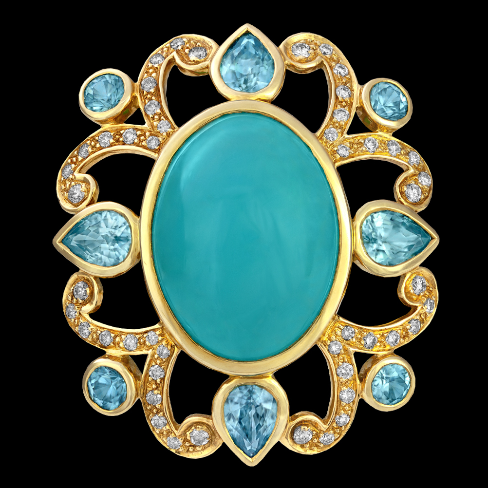 18K yellow gold with Arizona Chrysocolla and Zircon.